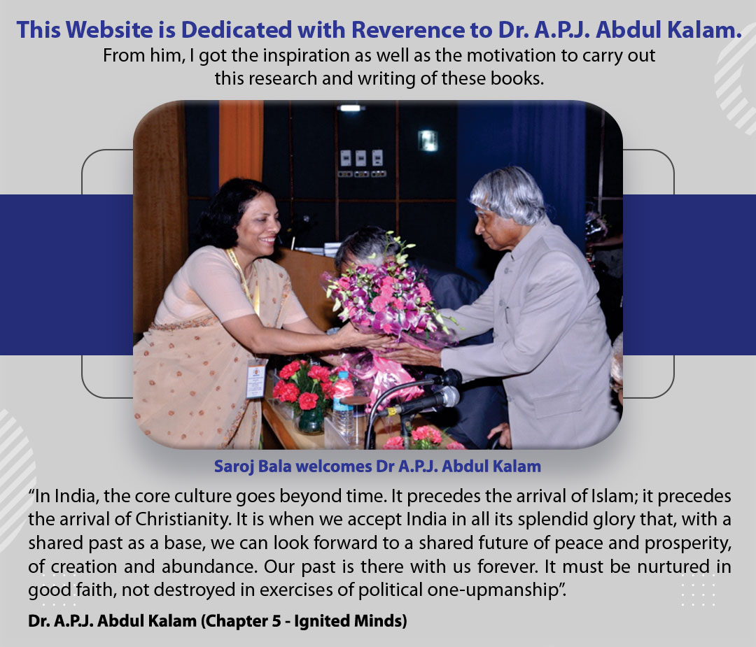 To determine the historicity and antiquity of Vedic and Epic Eras, in-depth research has been carried out by Mrs Saroj Bala for the last twenty years, in close coordination with eminent scholars and scientists from different disciplines. The objective has been to ensure that reliable inputs from such scientists and scholars would ensure that the Books are written objectively, scientifically, and logically. Their names are given below in alphabetic order, with their designations on the dates of their participation in Seminars and Conferences -
