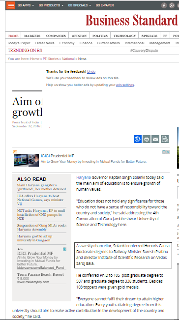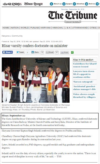For sincere and in-depth scientific research on the project titled, “Cultural Continuity from Rigveda to Robotics through Sky simulations of Astronomical References and Supporting Scientific Evidences”, the Director of I-SERVE, Mrs. Saroj Bala was awarded the degree of Doctor of Science (Honoris Causa) by Guru Jambheshwar University of Science and Technology, Hisar. During the same Convocation, this degree was awarded to Shri Suresh P. Prabhu, Minister of Railways, Govt. of India. Some pictures are attached along with the Citation.