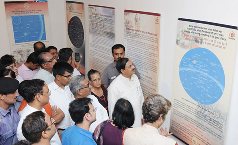 - On display in the Exhibition, are the sky views generated by using Planetarium software, which match the references in Mahabharata sequentially right from the date of departure of Pandavas for thirteen years of exile after they lost everything in the game of Dice in 3153 BC, to the sequential events leading to Mahabharata war in 3139 BC and thereafter right up to the solar eclipse seen from Dwarka before it submerged 36 years after Mahabharata war in 3102 BC.