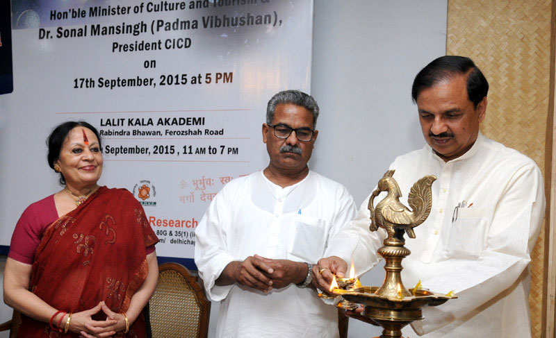 The Minister of state for Culture, Tourism and Civil Aviation, Dr Mahesh Sharma, the President of CICD, Dr Sonal Mansingh (Padma Vibhushan) and Dr Krishan Gopal Sharma, Sah Sar Karyavah of RSS - jointly inaugurating the Unique Exhibition on "Cultural Continuity from Rigveda to Robotics", in Lalit Kala Academy in New Delhi on September 17, 2015.