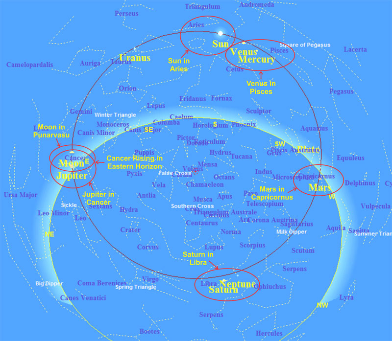 Skyview depicting planetary positions described at the time of birth of Shri Ram on Chaitra shukla navami in 5114 BCE, printed by Planetarium